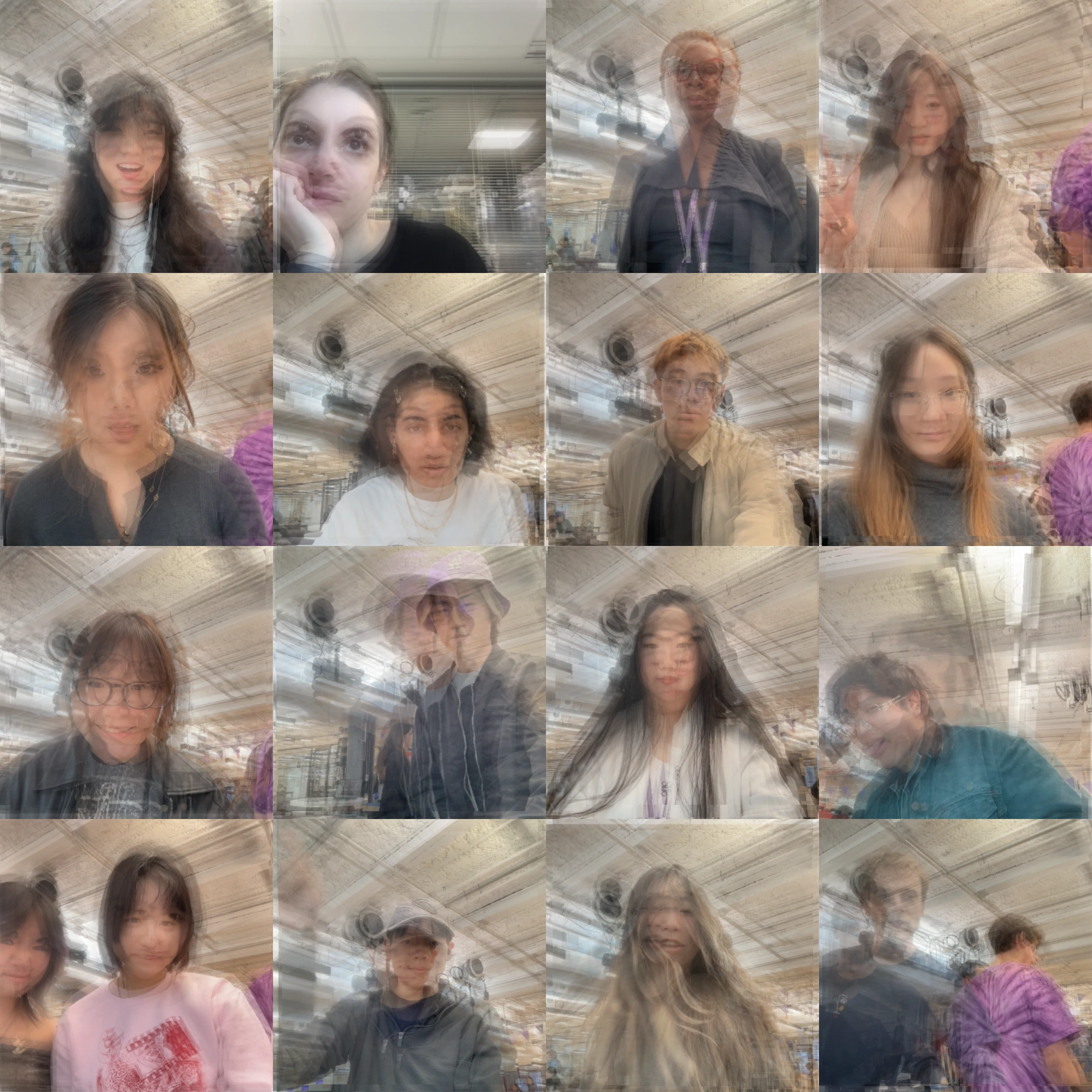 When the user clicks the shutter button, the capture() function is called. Which will take the 10 photos currently stored in the array and draw them not onto the main canvas but a "graphics", basically a hidden canvas created using the p5 function createGraphics(). Each of the photo is given an opacity with the tint() function in p5, and using the imageMode(CENTER) and randomGaussian() functions, the program shift each photo to a random offset from the center.