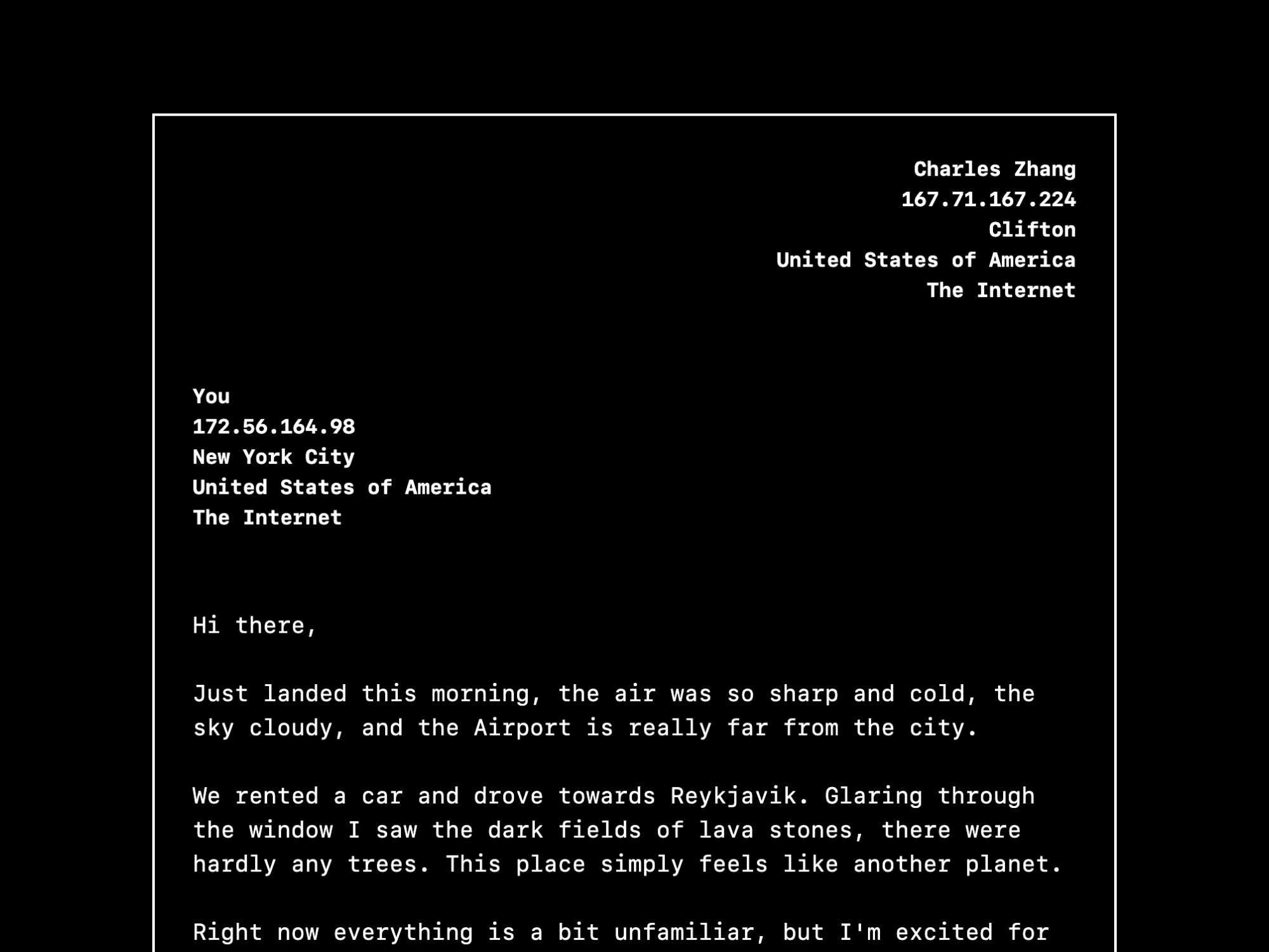 There's a total of 5 envelopes, leading to 3 letters and 2 postcards, each about a day on my trip. For the letters, I created a layout similar to a physical letter—with the sender and recipient addresses (in this case IP addresses) on the top and the content below them. For the postcard, I created a flip-over hover animation using CSS, recreating the feel of flipping over a physical postcard and seeing the message on it.
